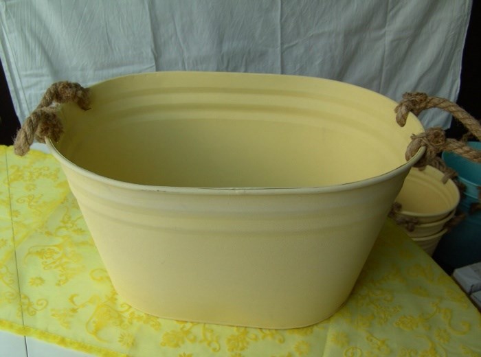 Leuk metalen emmer in mooie kleur geel met hengsel van touw.