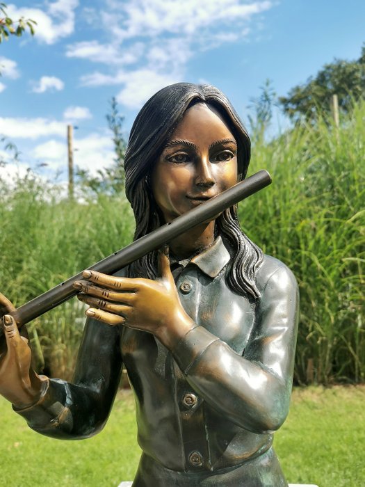 Een mooi brons beeld van een jong meisje dat een fluit speelt. Prachtig stuk en zeer mooi tuinsculptuur / Tuinbeeld. Gemaakt uit brons en met veel detail afgewerkt. Prachtig te plaatsen op een muurtje of zuil. De afmetingen van dit mooie tuinsculptuur zijn als volgt: