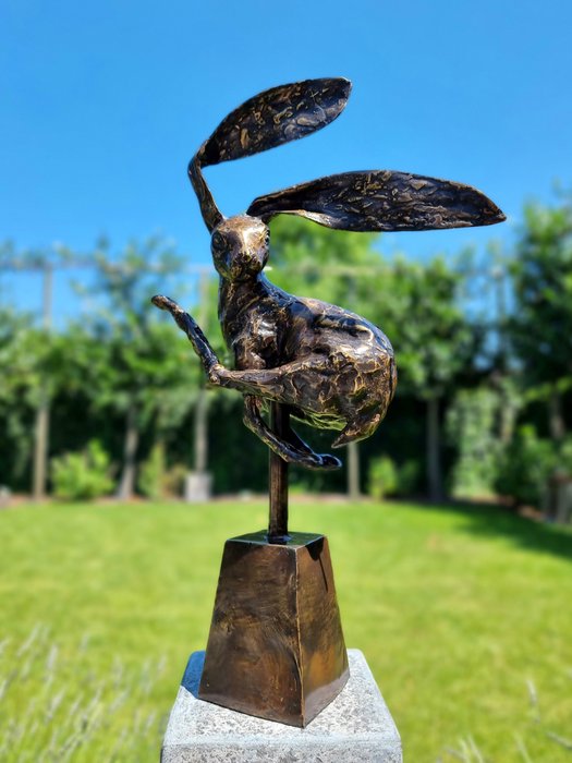 Uitmuntend sculptuur van een bronzen haas. De haas springt door de lucht. Een bronzen sculptuur vol beweging en emotie. De afmetingen van dit bronzen kunstwerkt zijn als volgt (+/-):