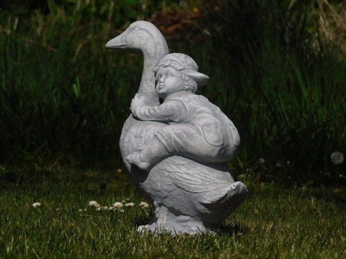 Een prachtig gedetailleerd beeld van een gans met kind, volledig gemaakt van steen en is weerbestendig!
