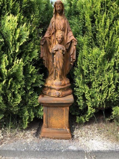 Dit mooie vol stenen mariabeeld met kindje op sokkelin oxide, vol detail gemaakt af een origineel beeld, prachtig ontwerp.