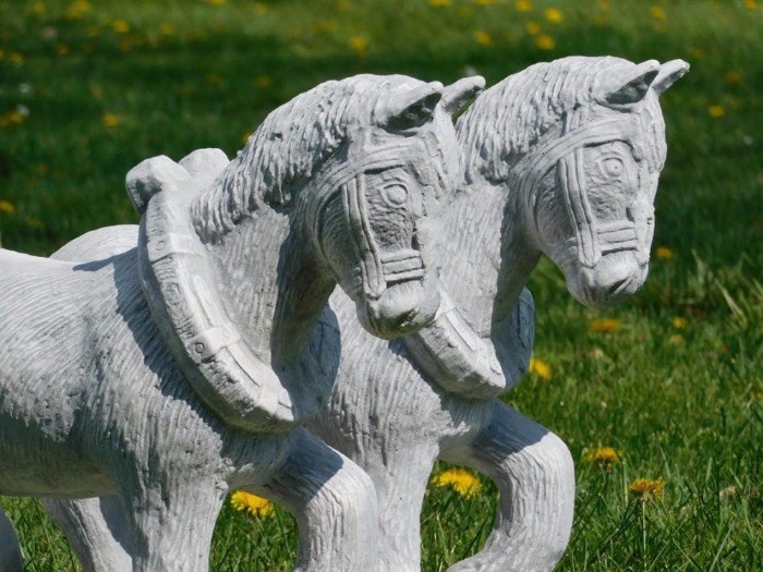 Een prachtige set beelden van twee paarden met een wagen, volledig gemaakt van steen en weerbestendig!
