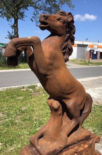 Een prachtig XXL beeld paard op XXL sokkel, vol massief steen oxide, lijkt wel gietijzer, geweldig!!
