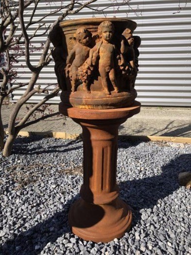 Zeer forse en zware bloembak, vol steen oxide, met engelen, op sokkel oxide, prachtig ontwerp