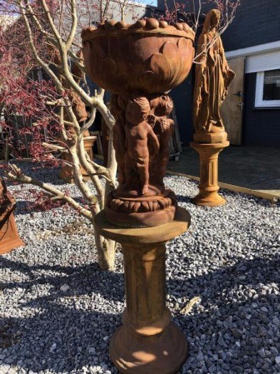 Zeer forse en zware bloembak, vol steen oxide, gedragen door engelen, op sokkel oxide, prachtig ontwerp