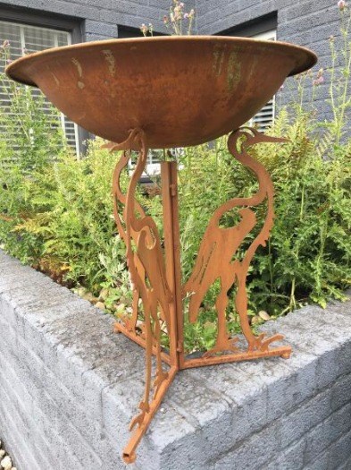 Prachtig ontwerp, deze vuurkorf gedragen door 3 reigers, geheel van smeedijzer. Ook geschikt om als bloembak te gebruiken.