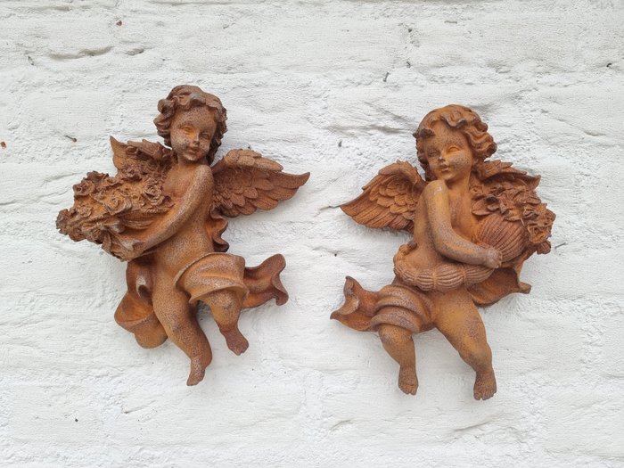 Gietijzeren muursculpturen van een koppel engelen met een boeket bloemen. Cherubijn. Zeer bijzondere en gedetailleerde muurdecoratie. De afmetingen per stuk zijn als volgt (+/-):