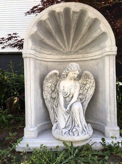 Engel beeld in bidkapel massief en zwaar dus geschikt om in weer en wind te plaatsen. Het weer zal de beelden in kleur doen veranderen
