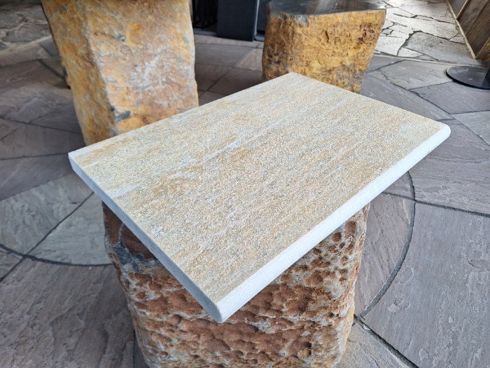 Prachtige afwerking van uw zwembad. Zeer mooi in combinatie met de Brasil Yellow flagstones. Topkwaliteit zwembadrand met een mediterraans kleurenpalet.