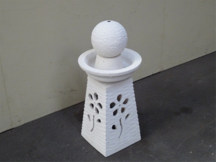 Fontein en tevens vogelbadje speciaal voor in uw tuin. De fontein, gemaakt van zandsteen, is prachtig afgewerkt en bestaat uit vier delen; een groot voetstuk met een bloem er in bewerkt, een schaal en een kleiner standaard met daar bovenop een mooi afgewerkte bol met een tuitje erin verwerkt waaruit het water komt.