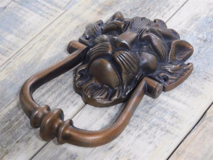 Mooie, stevige deurklopper van een leeuwenkop, gemaakt van gietijzer in koper kleur.