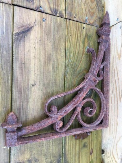 De hoekdrager heeft een natuurlijke patina van roest. Gietijzer roest nooit door echter kunt u de roestpatina af borstelen en het oppervlak eenvoudig met een vernis van uw keuze voorzien.