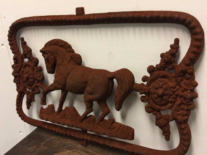 Zwaar en fors gietijzeren wandornament met afbeelding van een paard, prachtig.