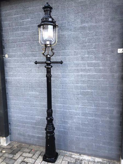 Deze filigrane tuinlantaarn zwart, buitenlamp, die lijkt op een historische originele straatlantaarn uit de oude Parijse wijken,