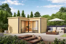 Douglas tuinhuis met zadeldak en overkapping te koop. De Douglasvision zadeldaken Modulair zijn verkrijgbaar in twee dieptematen, 310 cm en 400 cm. Het zadeldak wordt geleverd als bouwpakket: alle staanders, gordingen en ringbalken zijn voorgeboord en ingekeept. Hierdoor is het verblijf gemakkelijk in elkaar te zetten. Door gebruik te maken van wanden kunt u uw verblijf naar eigen wens indelen. Er wordt geen dakbedekking meegeleverd, zo kunt u zelf bepalen of het dak wordt voorzien van dakpannen ...