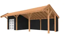 Het Douglasvision kapschuur basispakket bestaat uit: • Douglas geschaafde staanders, duplo verlijmd 14x14 cm • Douglas geschaafde gordingen 4,5x16 cm • Douglas geschaafde schoren 4,5x14,5 cm • Lariks geschaafd dakbeschot met veer en groef 1,6x11,6 cm • Douglas afdeklijsten 1,6x15 cm • Douglas geschaafde boeiboorden 2,8x16,5 cm • Hoogte 330 cm en 310 cm • Duidelijke handleiding • Bevestigingsmaterialen Funderingsmaten (BXD): 892 x 306,5cm Buitenmaten (BXD): 897 x 462cm De Douglasvision kapschuur ...