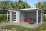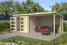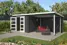 Deze blokhut met overkapping is voorzien van een schuin aflopend dak met de afwatering aan de achterzijde. Dit type blokhut met overkapping kan gespiegeld worden opgebouwd. In dat geval wordt het overkapte deel aan de linkerkant geplaatst en het dichte gedeelte rechts. De hoge deuren met lage dorpel maken het gemakkelijk om spullen, zoals bijvoorbeeld een fiets, in het tuinhuis te plaatsen.