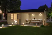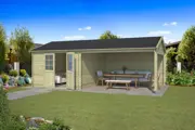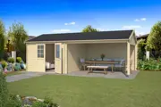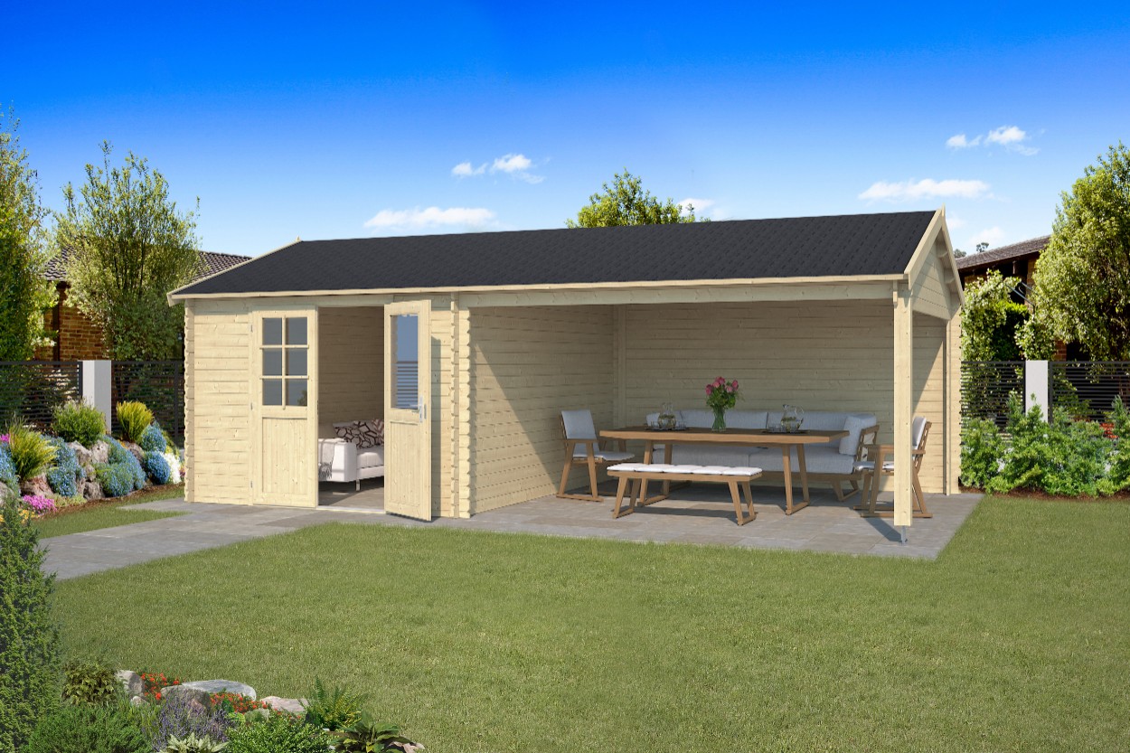 Blokhut met overkapping Octavio 680x380 Onbehandeld vurenOutdoor Life Products is een prachtige, ruime blokhut met een royale overkapping. Onder de overkapping is het heerlijk vertoeven. Het afgesloten gedeelte van deze blokhut is geschikt als bergruimte voor bijvoorbeeld waardevolle spullen en/of tuingereedschap.
