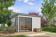 Dit modern vormgegeven Tuinhuis Olivia heeft een fundamentmaat van 385cm(b) x 295cm(d). De 28mm dikke vurenhouten wanddelen zijn uitgevoerd met mes en groef. De stapelbouw methode in combinatie met hoekpalen en schroefsysteem zorgt voor een zeer sterke constructie. Dit mooie design tuinhuis wordt geleverd inclusief een aluminium schuifpui in de voorwand waarvan beide panelen schuivend zijn en het linker paneel afsluitbaar is met een sleutel. In de linkerzijde wordt een vast aluminium glaspaneel gemonteerd. De aluminium delen zijn mat antracietgrijs van kleur en de panelen zijn voorzien van enkelglas. Dit tuinhuis is door de enorme lichtinval ook geschikt als tuinkamer, atelier of als tuinkantoor. U kunt dit tuinhuis ook in spiegelbeeld monteren. Het basispakket wordt geleverd inclusief montagehandleiding, onderdelenlijst en uiteraard alle benodigde bevestigingsmaterialen. Dit Tuinhuis wordt zonder dakbedekking geleverd, hiervoor is optioneel een EPDM dakbedekking pakket bestelbaar. Dit stapelbouwbouw systeem is door een handige doe-het-zelver goed zelf te monteren, je moet wel even met z'n tweeën zijn. Dit tuinhuis wordt als bouwpakket bij u thuis geleverd.