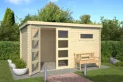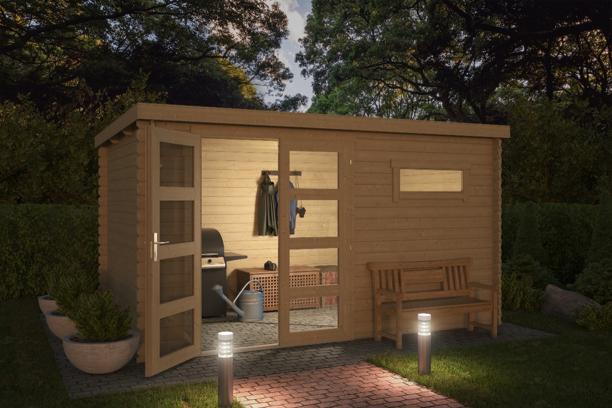 De Blokhut Timian 380x230 Onbehandeld vuren van Outdoor Life Products is een prachtige blokhut met een eigentijdse look. Achter de afsluitbare dubbele deur met lage dorpel is bergruimte voor waardevolle spullen en/of tuingereedschap.