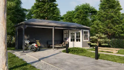 blokhut Gretel 250x250 cm heeft een strakke uitstraling en is een blikvanger in uw tuin. Met de ruime zijluifel van 550 cm is er extra ruimte om bijvoorbeeld de fietsen neer te zetten of om een heerlijke zitplek te creëren. Met de wind- en waterdichte hoekverbindingen blijven al uw spullen veilig en droog staan.