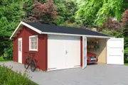 Garage Falkland van het merk Lasita Maja heeft een fundamentmaat van 575cm(b) x 575cm(d). De 44mm dikke vurenhouten wanddelen zijn uitgevoerd met een dubbele veer en groef en een wind en waterkerende hoekverbinding. De traditionele blokhut-stapelbouw methode zorgt voor een zeer sterke en stabiele constructie. Deze mooi vormgegeven berging met haar twee dubbele houten garagedeuren, de enkele loopdeur en het dubbel draai/tuimelraam is bijzonder geschikt als royale berging, garage of klusruimte. De enkele loopdeur en het dubbele raam worden los meegeleverd en kunt u plaatsen (inzagen) op de plek naar uw eigen wens, op de foto nu in de linker zijwand geplaatst. De deur en raam zijn uitgevoerd met enkelglas. Bij deze garage worden geïmpregneerde fundamentbalken (45x70mm) meegeleverd, opdat de 1e wandlaag vrij en droog van de ondergrond komt te staan. Het basispakket wordt geleverd inclusief montagehandleiding, onderdelenlijst, alle benodigde bevestigingsmaterialen, deur- en raambeslag en een houten windankerset. Dakbedekking is optioneel bestelbaar. Het stapelbouw blokhut systeem is door de handige doe-het-zelver prima zelf te monteren en dit tuinhuis wordt als bouwpakket bij u thuis geleverd.