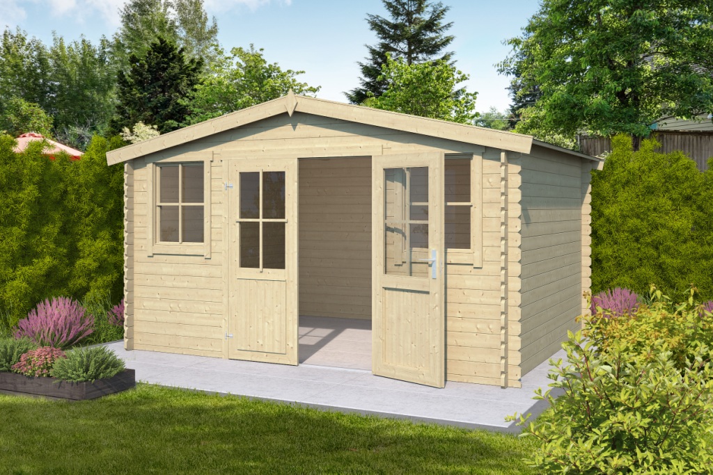 De Blokhut Dallas 376x292 Onbehandeld vuren van Outdoor Life Products is een sfeervolle en royale blokhut met een traditionele uitstraling. Achter de afsluitbare dubbele deur met lage dorpel is bergruimte voor waardevolle spullen en/of tuingereedschap.