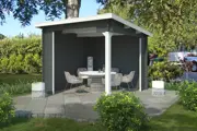 De Overkapping Lara 275x275 heeft een fundamentmaat van 275cm(b) x 275cm(d). De 28mm dikke vurenhouten wanddelen zijn uitgevoerd met veer en groef en een wind en waterkerende hoekverbinding. De traditionele blokhut-stapelbouw methode zorgt voor een sterke en stabiele constructie. Het basispakket wordt geleverd inclusief montagehandleiding, onderdelenlijst, alle benodigde bevestigingsmaterialen, en een houten windankerset. Dit tuinhuis wordt zonder dakbedekking geleverd, hiervoor kunt u gelijktijdig het duurzaam en hoogwaardig Outdoor Life Products EPDM dakpakket bestellen. Het stapelbouw blokhut systeem is door de handige doe-het-zelver prima zelf te monteren en dit tuinhuis wordt als bouwpakket bij u thuis geleverd.