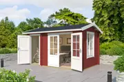 Het Tuinhuis Wrexham 1 van het merk Lasita Maja bestaat uit 2 ruimtes en heeft een fundamentmaat van 380cm(b) x 240cm(d). De 44mm dikke vurenhouten wanddelen zijn uitgevoerd met een dubbele veer en groef en een wind en waterkerende hoekverbinding. De traditionele blokhut-stapelbouw methode zorgt voor een zeer sterke en stabiele constructie. Dit prachtige tuinhuis met haar dubbele deur, enkele deur en het dubbel draai/tuimel raam is bijzonder geschikt als tuinkamer of als tuinkantoor in combinatie met een berging. De deuren en ramen zijn uitgevoerd met isolatieglas en aluminium dorpelstrips, de houten kruisverdeling wordt los meegeleverd waardoor u zelf de keuze heeft of u deze wilt gebruiken. Door de meegeleverde houten vloer staat het tuinhuis vrij van de ondergrond waardoor deze van binnen droog en schoon blijft. De vloerconstructie bestaat uit hogedruk geïmpregneerde onderliggers (70x45mm) en vuren vloerdelen voorzien van veer en groef (90x18mm). Het basispakket wordt geleverd inclusief montagehandleiding, onderdelenlijst, alle benodigde bevestigingsmaterialen, deur- en raambeslag en een houten windankerset. Dakbedekking is optioneel bestelbaar. Het stapelbouw blokhut systeem is door de handige doe-het-zelver prima zelf te monteren en dit tuinhuis wordt als bouwpakket bij u thuis geleverd.