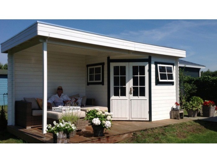 Goedkoop modern tuinhuis met plat dak en overkapping.