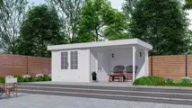 Goedkoop nieuw modern tuinhuis met plat dak en overkapping.