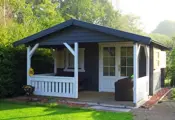 Goedkoop tuinhuis met overkapping in 50mm dik scandinavisch vuren hout.