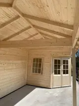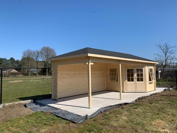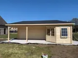 Nieuw goedkoop modern tuinhuis met piramidedak en overkapping.