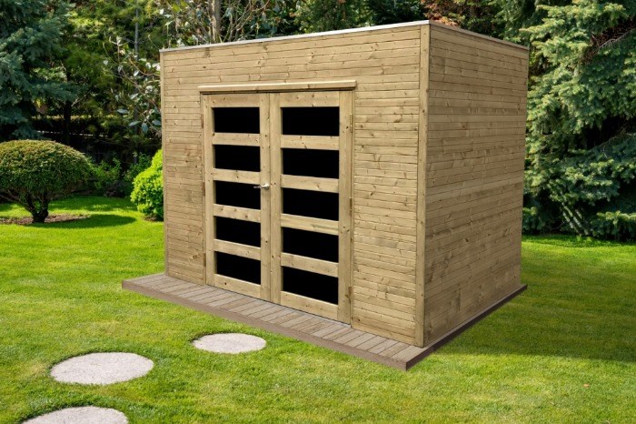 Blokhutprofiel in paneelvorm van 19mm dik scandinavisch geïmpregneerd vuren hout, overschilderbaar, een dubbele deur met 3mm helder veiligheidsglas, dakhelling van 1°, EPDM-dakfolie op het dak, verluchtingsrooster, deurklinken met kindvriendelijk slot, sneeuwlast is 75kg/m2.
