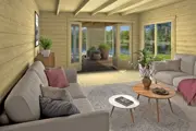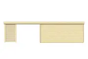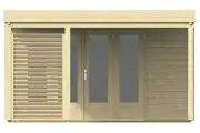 Deze moderne blokhut heeft een afmeting van 500x400 cm, en een luifel van 400 cm. De blokhut heeft een plat dak dat inclusief EASY-Roofing geleverd wordt.