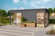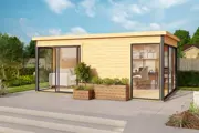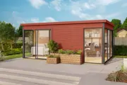 Dit strak modern vormgegeven Tuinhuis Domeo 3 van het merk Lasita Maja heeft een fundamentmaat van 508cm(b) x 322cm(d). De 44mm dikke vurenhouten wanddelen zijn uitgevoerd met een dubbele veer en groef. De stapelbouw methode in combinatie met hoekpalen en schroefsysteem zorgt voor een zeer sterke constructie. Dit mooie design tuinhuis wordt geleverd inclusief een aluminium schuifpui in het front waarvan het beide delen schuivend zijn en het linkerpaneel afsluitbaar is met een sleutel. In de rechter zijwand bevindt zich een schuifpui met 3 schuifbare glaspanelen waarvan het linker paneel met een slot afsluitbaar is. Rechts in het front en in de linker zijwand is een vast glaspaneel gesitueerd. De aluminium delen zijn mat antractietgrijs van kleur en de panelen zijn voorzien van dubbelglas. De hoeken van deze Domeo worden afgewerkt met antracietgrijze metalen covers. De Domeo is door de enorme lichtinval bijzonder geschikt als tuinkamer, atelier of als tuinkantoor. Door de meegeleverde houten vloer staat het tuinhuis vrij van de ondergrond waardoor deze van binnen droog en schoon blijft. De vloerconstructie bestaat uit hogedruk geïmpregneerde onderliggers (70x45mm) en vuren vloerdelen voorzien van veer en groef (90x18mm). Het basispakket wordt geleverd inclusief montagehandleiding, onderdelenlijst, alle benodigde bevestigingsmaterialen en deurbeslag . Dakbedekking is optioneel bestelbaar, wij adviseren u hiervoor rubberfolie te gebruiken (EPDM). Dit stapelbouw systeem is door een handige doe-het-zelver goed zelf te monteren, maar je moet wel met z'n tweeen zijn. Dit tuinhuis wordt als bouwpakket bij u thuis geleverd.