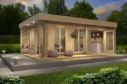 Het modern vormgegeven Tuinhuis Dominica van het merk Lasita Maja heeft een fundamentmaat van 570cm(b) x 380cm(d). Dit tuinhuis heeft aan de voorzijde en aan één zijkant een oversteek van 80cm. De 40mm dikke vurenhouten wanddelen zijn uitgevoerd met een dubbele veer en groef en een wind en waterkerende hoekverbinding. De traditionele blokhut-stapelbouw methode zorgt voor een zeer sterke en stabiele constructie. Dit bijzondere tuinhuis met haar twee openslaande dubbele deuren en de drie draai/tuimel ramen is bijzonder geschikt als tuinkamer, logeerverblijf of als tuinkantoor. De deuren en ramen zijn uitgevoerd met isolatieglas en aluminium dorpelstrips. Door de meegeleverde houten vloer staat het tuinhuis vrij van de ondergrond waardoor deze van binnen droog en schoon blijft. De vloerconstructie bestaat uit hogedruk geïmpregneerde onderliggers (70x45mm) en vuren vloerdelen voorzien van veer en groef (90x18mm). De vloerdelen voor buitengebruik zijn verduurzaamd door impregnatie en hebben een lichtgroene kleur. Het basispakket wordt geleverd inclusief montagehandleiding, onderdelenlijst, alle benodigde bevestigingsmaterialen, deur- en raambeslag en een houten windankerset. Dakbedekking is optioneel bestelbaar. Het stapelbouw blokhut systeem is door de handige doe-het-zelver prima zelf te monteren en dit tuinhuis wordt als bouwpakket bij u thuis geleverd.