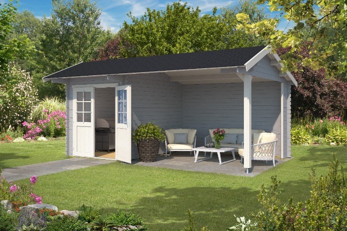 Nieuw goedkoop tuinhuis met zadeldak en overkapping te koop.