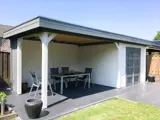 Goedkoop modern tuinhuis met plat dak en overkapping.