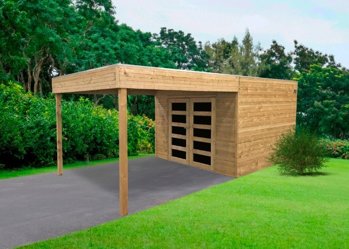 Blokhutprofiel in paneelvorm van 19mm dik scandinavisch geïmpregneerd vuren hout, overschilderbaar, een dubbele deur met 3mm helder veiligheidsglas, dakhelling van 1°, EPDM-dakfolie op het dak, verluchtingsrooster, deurklinken met kindvriendelijk slot, sneeuwlast is 75kg/m2.