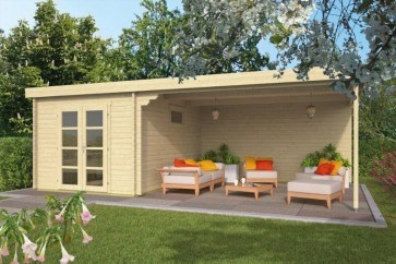 Nieuw goedkoop modern tuinhuis met plat dak en overkapping.