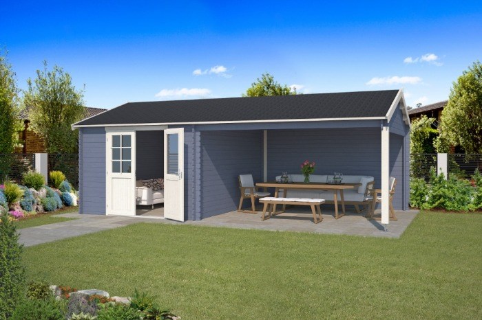 Nieuw goedkoop tuinhuis met zadeldak en overkapping te koop.
