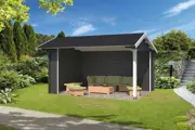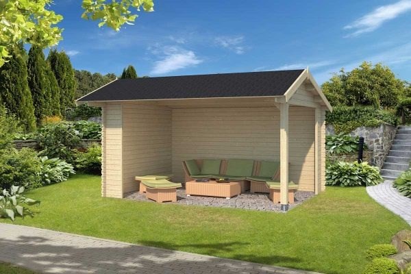 Nieuw goedkoop tuinhuis met zadeldak 34 mm blokhutprofiel te koop.