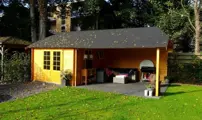 Nieuw goedkoop cottage tuinhuis met wolfskap en overkapping.