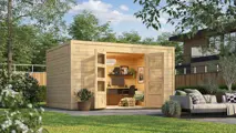Het tuinhuis Quby 400x300 heeft een fundamentmaat van 400cm(b) x 300cm(d). De massieve 28mm dikke vurenhouten wanddelen zijn uitgevoerd met veer en groef. De stapelbouw methode in combinatie met hoekpalen en schroefsysteem zorgt voor een zeer sterke constructie. Dit modern en strak vomgegeven tuinhuis met haar dubbele dichte deur is onder andere geschikt als hobby of werkruimte maar ook als berging voor uw tuinspullen. Het vele glas in de extra hoge deuren zorgt voor een fraaie lichtinval. Het basispakket wordt geleverd inclusief een duidelijk montagehandleiding, onderdelenlijst en uiteraard alle benodigde bevestigingsmaterialen zoals het deurbeslag. Dit tuinhuis wordt zonder dakbedekking geleverd, hiervoor kunt u gelijktijdig het duurzaam en hoogwaardig Outdoor Life Products EPDM dakpakket bestellen. Het stapelbouw blokhut systeem is door de handige doe-het-zelver prima zelf te monteren en dit tuinhuis wordt als bouwpakket bij u thuis geleverd.