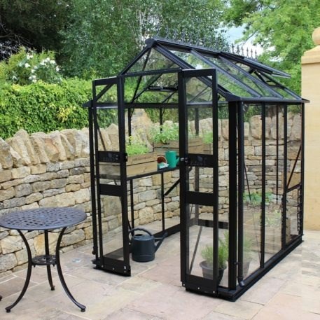 Het frame van de Birdlip is standaard leverbaar in een blanke uitvoering. Voor een meer luxueuze uitstraling en / of eenheid met de omgeving waarin de kas wordt geplaatst is deze kas leverbaar in een zwarte of klassiek donkergroen gecoate uitvoering.