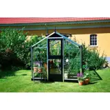 De Compact 50, blank. De Compact is een echte kwaliteitskas, waarbij een solide constructie en eigentijds design worden gecombineerd. Het geraamte van de kas bestaat uit een aluminium constructie die zowel in blank als antracietgrijs gecoat leverbaar is. Andere frameonderdelen (deur, ramen, goten en de regenafvoer) worden standaard in zwarte kleur geleverd. Dit resulteert in een opvallend contrast.