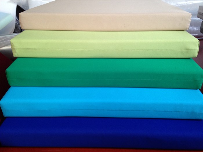 Op maat gemaakte lounge kussens in 6 cm stevig polyether, gestoffeerd met een waterafstotende stof en netjes afgewerkt met een rits. De stof is er in de kleuren: zwart, donker bruin, grijs, zand, beige, donker blauw, blauw, aqua, groen, appeltjes groen, rood, Bordeaux rood, oranje, roze.