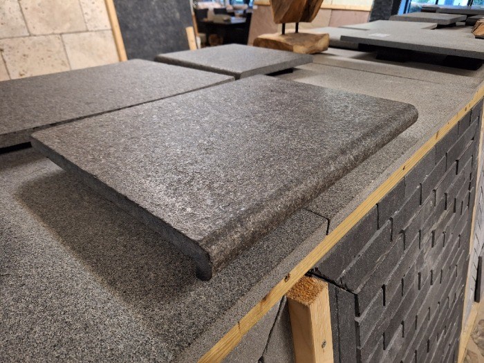 randtegel 80x40x3/5 cm gevlamd geborsteld / gezoete haakse overhangende haakse neus € 47,95 p/st