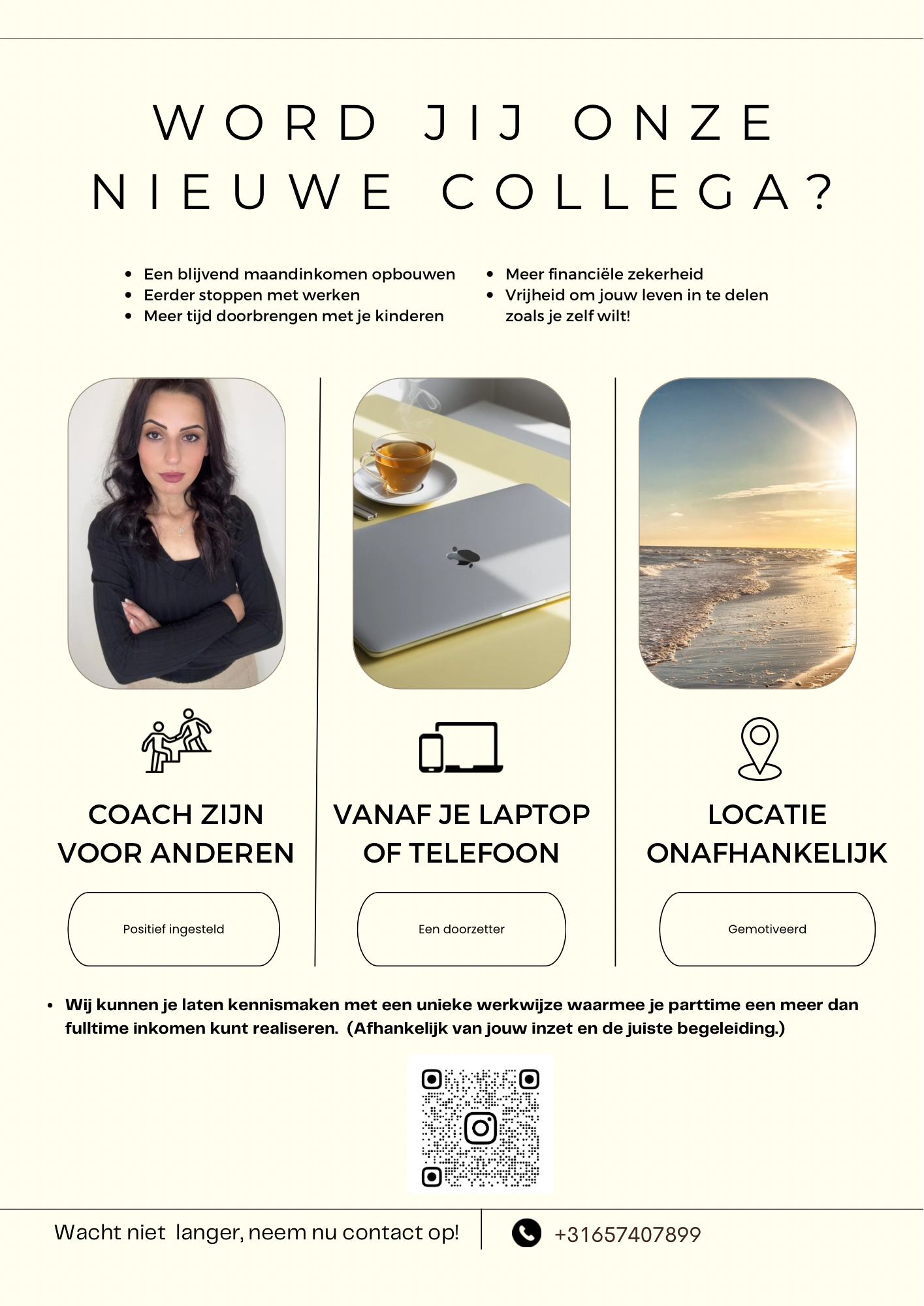 Wil jij meer vrijheid in je tijd en inkomen? Wil je zorgeloos kunnen werken, zonder afhankelijk te zijn van vaste tijden of locaties? Dan is dit iets voor jou! Wil jij vrijblijvend onze video uitleg zien?Neem contact op via www.beyourfocus.nl!